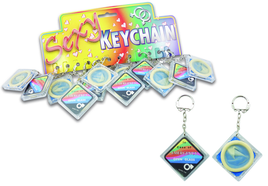 Keychain with Condom in Box Pendant, 12 pcs. on display card.