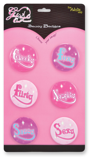 Girls' Night Out Saucy Badges, 6 pcs. on hanging card with polybag.