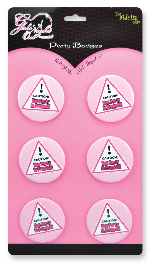 Girls' Night Out Hen Party Badges, 6 pcs. on hanging card with polybag.